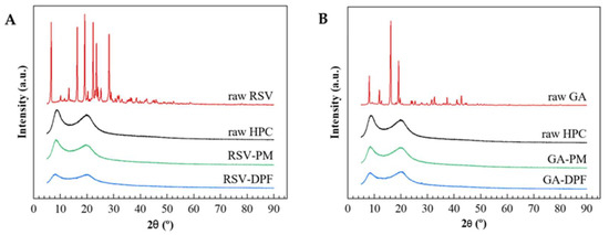 XRPD determined the physical state of raw phenolic compounds, as well as that of PM and DPF of RSV–DPF and GA–DPF. The diffractograms for both systems appear in Figure 5. Unprocessed RSV depicts many sharp peaks diffractions at approximately 2θ = 6°, 16°, 19°, 22°, 23.5° and 28°, whereas unprocessed GA depicts the main sharp peaks at approximately 2θ = 8°, 12°, 16° and 19°, confirming the crystalline state of both raw compounds. RSV and GA patterns agree with the literature [45,46].