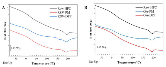 DSC evaluated potential thermal behavior changes in the SASD powders and the polymer/compound mixtures. Both systems’ thermograms appear in Figure 6. Run 1 was not represented as it was equal to that previously reported, with the removal of water. The thermal profiles of the DPF and the physical mixture for both RSV–DPF and GA–DPF were identical to those of the raw HPC. All thermograms revealed a reproducible endothermic peak around 190–200 °C related to the melting point of the small crystalline domain of HPC, as previously discussed, suggesting that the melting temperature of the SASD-processed HPC was not affected by the addition of the bioactive compound.