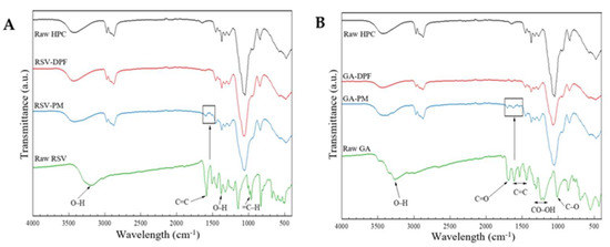 Figure 7 shows an overlapping of the ATR-FTIR spectra of the raw compounds, physical mixtures (PM) and DPFs, for both RSV–DPFs and GA–DPFs, respectively. The wavelength signals of both antioxidant compounds presented a broad peak around 3200 cm−1 associated with the phenolic hydroxyl bonds (O–H stretch). The RSV spectrum shows its characteristic absorption bands: at 1600 corresponding to the stretching of C=C bond of the aromatic ring; at 1580 cm−1 assigned to the stretching of the C=C olefinic bond; at 1380 cm−1 relative to the O–H bending; at 1143 cm−1 confirming the C–O stretching for phenolic compounds; at 965 cm−1 attesting to the alkene (=C–H bending) of the trans form of the RSV; at 828 cm−1 with respect to the =C–H vibration bands of arene conjugated to the olefinic group; and the deformation bands at 671–500 cm−1 corresponding to the =C–H of the olefinic group. The GA spectrum shows its characteristic absorption bands: at 1690 cm−1, corresponding to the stretching of C=O bonds of the carboxylic acid; at 1610, 1533, and 1440 cm−1, typical of the stretching vibrations of C=C bonds of the aromatic ring; in the 1300–1200 cm−1 range assigned to the CO–OH stretching and bending, indicating the combination of O−C–C asymmetric stretching and the OH bending; and at 1020 cm−1, related to the C–O stretching. These results were in agreement with the literature for both phenolic compounds [49,50,51].