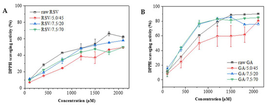 Figure 8A shows that all the processed DPFs have a slightly lower antioxidant activity than the raw forms, among which those with higher solid content, namely RSV/7.5/20 and RSV/7.5/70, exhibit greater antioxidant activity. This indicates that higher RSV concentrations in the initial SASD feed formulation increase the final DPF antioxidant capacity. The curve tends to stabilize for all samples as concentrations reach 2000 µM, meaning that the RSV antioxidant power is depleted as it acts as a limiting reagent. Figure 8B shows that the two GA–DPFs with higher solid content (GA/7.5/20 and GA/7.5/70) presented greater antioxidation up to about 1300 µM. Those with lesser solid content (GA/5.0/45) consistently demonstrated lower antioxidation as a result of lower phenolic loading in the formulation. The curve fluctuates, however, more due to the greater associated error and the last point suggests an activity increase similar to other formulations. After 1250 µM, all sample curves begin to stabilize, which may correspond to the near-total DPPH radical conversion.