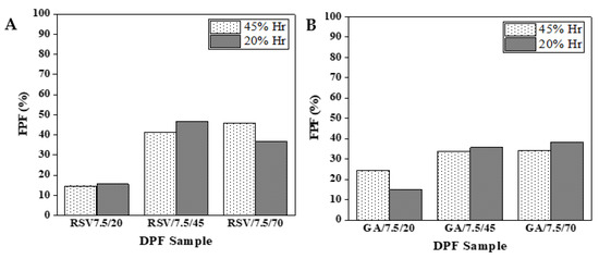 Fine particle fraction (FPF) for 7.5 %w/v DPFs stored at different %RH, varying ethanol volume from 20 to 70 %v/v: (A) RSV–DPF; (B) GA–DPF.