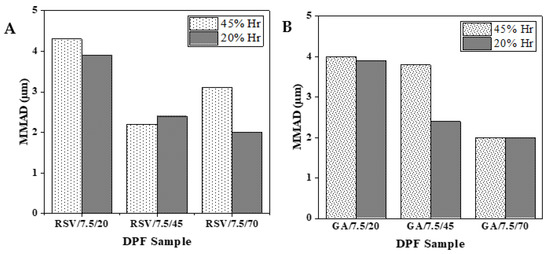Mass median aerodynamic diameter (MMAD) for 7.5 %w/v DPFs stored at different %RH, varying ethanol from 20 to 70 %v/v: (A) RSV–DPFs (B) GA–DPFs.