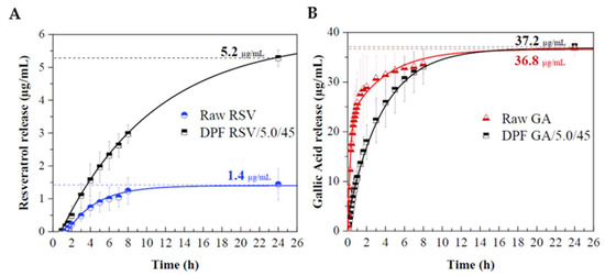 In vitro phenolic release profiles in pH 5.5 PBS at 32 °C for 24 h of (A) raw RSV and DPF RSV/5.0/45 samples and (B) raw GA and DPF GA/5.0/45 samples, expressed in µg of phenolic per mL of solution.