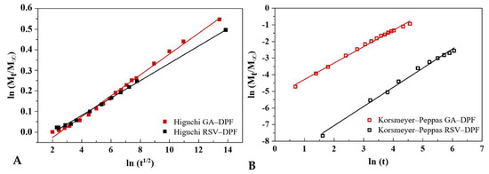 RSV and GA release profile from RSV–DPF and GA–DPF microparticles by (A) Higuchi and (B) Korsmeyer–Peppas mathematical models.