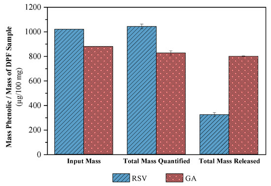 Input, total quantified (in ethanol), and total released (in pH 5.5 PBS) masses of RSV and GA expressed in µg of phenolic per 100 mg of total DPF sample.