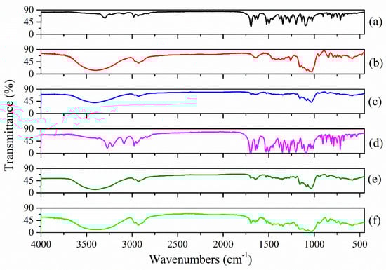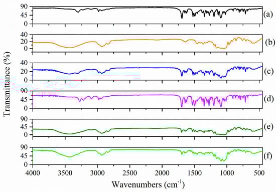 Figure 3 shows the FTIR spectra recorded for the (a) Nim; (b) HP-β-CD; (c) Nim–HP-β-CD physical mixture; (d) Nim–HP-β-CD coprecipitation method; (e) Nim–HP-β-CD lyophilization method; and the (f) Nim–HP-β-CD kneading method. The FTIR spectra of the Nim–HP-β-CD physical mixture (Figure 3c) and the inclusion complex obtained from the lyophilization method (Figure 3e) are comparable, but the peak intensities are more intense in the case of the lyophilization process. The characteristic peaks of nimodipine nearly disappeared or were shifted to a higher frequency, and only the peaks of HP-β-CD were observed at approximatively the same wavenumber. Thus, one can conclude that some characteristic functional groups from the drug molecule were involved in the inclusion processes. This demonstrates that the drug was included in the HP-β-CD cavity, and even a partial inclusion was observed in the case of the physical mixture. The FTIR spectrum of the Nim–HP-β-CD inclusion complex formed by the coprecipitation method (Figure 3d) demonstrated that almost all the peaks of nimodipine and HP-β-CD occurred without any significant differences, proving that in this case, only a partial inclusion occurred for a 1:1 molar ratio. In the case of the inclusion complex obtained using the kneading method (Figure 3f), the FTIR spectrum demonstrated some changes compared with previous spectra. Several peaks attributed to nimodipine were still present in the inclusion compound spectrum, which demonstrates that the inclusion process was not complete. The characteristic C=O absorption band of nimodipine, in the case of the lyophilization process (Figure 3e) shifted to a higher frequency (1701 cm−1) and was attributed to the disruption of nimodipine’s strong hydrogen bonds [].