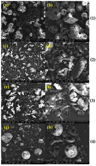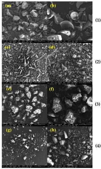 SEM images, at different magnifications, of (1) Nim–Me-β-CD physical mixture; (2) Nim–Me-β-CD coprecipitation method; (3) Nim–Me-β-CD lyophilization method; and (4) Nim–Me-β-CD kneading method; (a) 350×; (b) 800×; (c) 350×; (d) 800×; (e) 350×; (f) 800×; (g) 350×; (h) 800×.