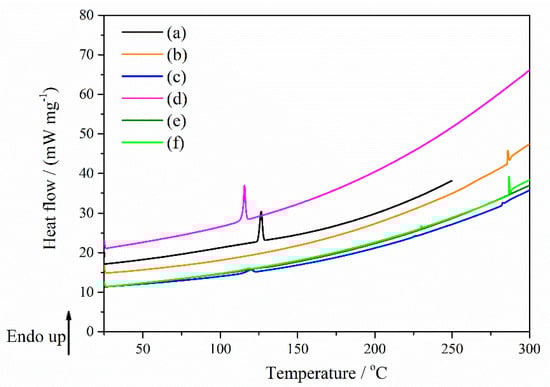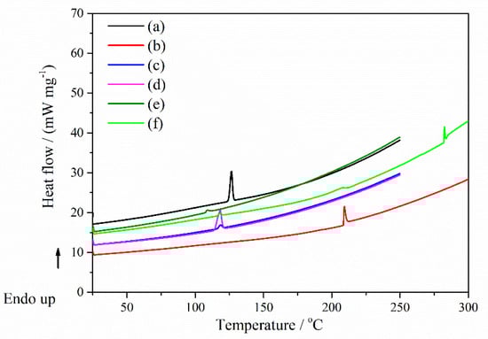 DSC measurements of the samples were carried out on a differential scanning calorimetry power compensated DSC 8500 (Perkin–Elmer, Waltham, MA, USA) calorimeter with a cooling system (Intracooler III) at a heating rate of 10 °C min−1, using dry nitrogen purge gas with a flow rate of 20 mL min−1. Samples of ~1 mg were held at 25 °C for 2 min before heating from 25 °C to 250 °C. Sealed aluminum pans were used in the experiments for all the samples, and the temperature and heat flow rate scale of the DSC was performed using high-purity indium as a standard (Tfus = 156.7 °C and ΔHfus = 28.5 J g−1). The Pyris Software for Windows was used to calculate the thermal effects. Thermograms were normalized to the sample weight.