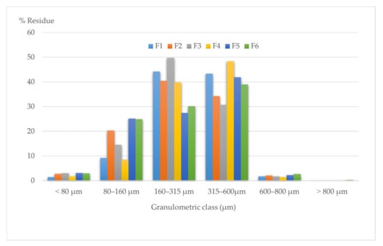 Compressibility: This was performed with a Vankel Tap Density Tester, produced by Vankel Industries Inc., Santa Clara, CA, USA. The bulk and tapped density, the Hausner ratio (HR), and the Carr Index (CI) were calculated. Fifty grams of each powder were gently introduced into the graduated cylinder and the bulk volume was measured. Then, it was subjected to a defined number of mechanical shocks, measuring the tapped volume of the material. HR and CI were used to predict the propensity of the powder to be compressed, where HR is the ratio between tapped density and bulk density and the CI is calculated according to the Equation (1):