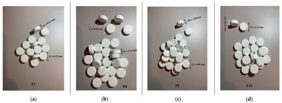 The general appearance of the four tablet formulations (a)—F7, (b)—F8, (c)—F9, (d)—F10.