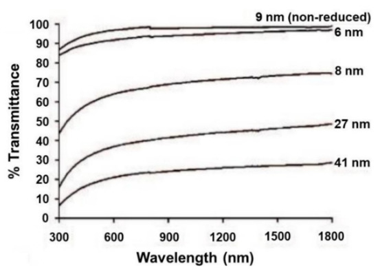 Optical transmittance spectra of the films with indicated thickness (Reproduced with permission from ref. [36]. Copyright 2008 American Chemical Society Publications).