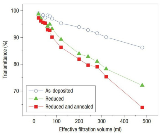 Transmittance at λ = 550 nm as a function of filtration volume for GO thin films prepared by different methods (Reproduced with permission from ref. [41]. Copyright 2008 Springer Nature Publications).