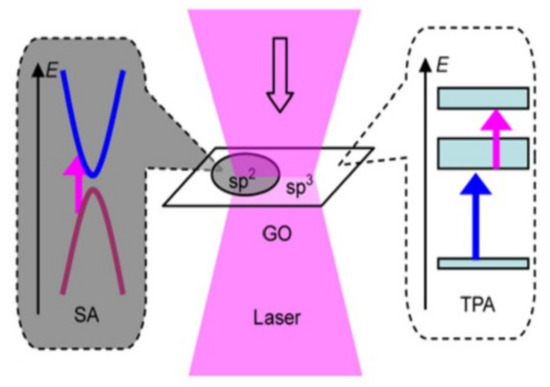 Two different nonlinear optics (NLO) regions (sp2 region and sp3 region) of ultrafast optical dynamics are shown in Figure 6 [44]. The NLO properties of GO are determined by the combined effect of sp2 and sp3 regions. In the sp2 region, the NLO absorption is mainly saturated absorption, while in the sp3 region, it is two-photon absorption. Through the controlled reduction process, the two-photon absorption gradually transforms to saturable absorption, which can be used for shorter detection wavelengths. Therefore, the NLO response can be tuned by adjusting the oxidation degree of GO and the position of the functional group. This feature gives GO a potential application in optoelectronic devices.