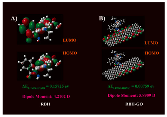 The geometry, energy level, dipole moment, and the electron cloud density distribution of (A) RBH and (B) RBH-GO. (Reproduced with permission from ref. [58]. Copyright 2021 Elsevier Publications.)