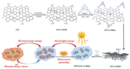 GO plays a very important role in the construction of new dyes. This is attributed to the excellent platform of GO, which can provide many reactive sites for organic functional dyes, greatly improving the performance of traditional dyes. The as-prepared dyes have been widely used in many fields owing to their unique characteristics. In addition to the field of dyeing and photoelectric devices, they also have extensive applications in solar-thermal energy storage. Some organic pigments and dyes with conjugated structures can absorb and convert light energy to thermal energy, such as anthraquinone dyes, polyaniline, and azo dyes [61,62]. Among these, anthraquinone dye has high molar extinction coefficients and the ability of strong visible light selective absorption, showing outstanding performance in the field of photothermal conversion. Nevertheless, the fluorescence generated by radiative leapfrogging can cut down its light-to-heat conversion efficiency to a certain extent. In order to improve the photothermal conversion efficiency, Wang et al. [63] grafted blue anthraquinone dyes (Bdye) onto GO (GO-co-Bdye) through amide reactions between the carboxy groups of GO and the amino groups of the dye, synthesizing a novel GO-based dye. GO, acting as a fluorescent receptor, can receive the fluorescence generated by the dye and convert it to thermal energy, which greatly improves the photothermal conversion performance of GO-co-Bdye. Via the method of blending and impregnating of the modified dyes and poly(ethylene glycol) (PEG), a new phase change material (PCM) can be obtained, which can be used in photo-driven energy conversion and storage. The preparing processes and mechanism are illustrated in Figure 12. The introduction of GO can not only enhance the photothermal effect, but can also serve as a supporting-material for PCM, improving the thermal stability, crystalline nature, and thermal conductivity of PCM. Therefore, GO plays an important role in the synthesis of efficient solar energy conversion materials.