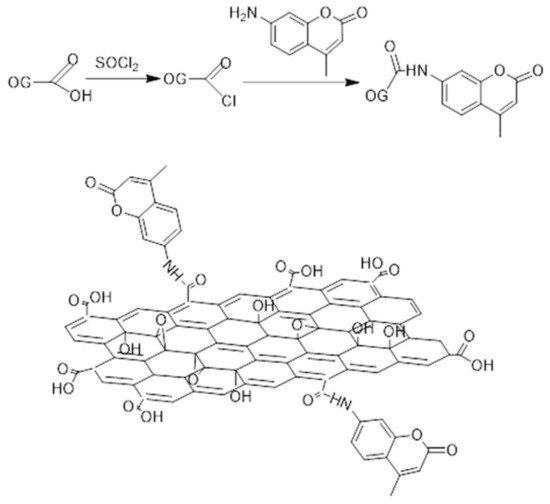 The existence of oxygen-containing functional groups on GO means it is often used as the starting material for fabrication of graphene-based dyes by acylation reactions. As well as the usual properties of GO, the property of no obvious toxic effects in vivo has also attracted the attention of researchers. If the fluorescent dyes are covalently functionalized onto GO, the application of dyes in bioimaging can be greatly expanded. Aminocoumarin dyes, which have high extinction coefficients and large Stokes shifts, can fluoresce in the blue-green spectral region. They can be covalently functionalized with GO to obtain a novel fluorescent nanohybrid (GO-NH-COUR) [64]. As shown in Figure 13, the 4-methyl-7-aminocoumarin (NH2-COUR) is grafted onto GO by the formation of amide bonds with GO. Compared with the fluorescence spectra of NH2-COUR, a slight bathochromic shift can be observed in the fluorescence spectra of GO-NH-COUR, which is ascribed to the formation of new luminescent centers at the surface of GO-NH-COUR. In addition, aminocoumarin plays an important role in the fluorescence property of the prepared nanohybrid. Due to the interaction between GO and NH2-COUR, GO-NH-COUR possesses excellent dispersion in aqueous solution and good optical properties. It can not only be used to reveal how the vis-NIR fluorescence of GO-based dye responds to pH, but can also be transfected into living cells for fluorescence imaging. Therefore, combining dyes and GO to prepare nanocomposites that can absorb and emit light in visible spectral regions will be an important research direction.