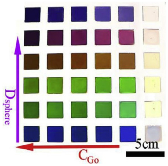 GO can not only improve the initial performance of pigments by modification of pigments, but can also be used to synthesize eco-friendly and non-fading pigments. To prepare this kind of pigment, amorphous photonic structures (APSs) have attracted researchers’ attention. Among APSs, the short-range-ordered APS plays an important role, which is due to the fact that it can produce angle-independent non-iridescent structural colors when the structural characteristic sizes are comparable to the visible wavelengths [81,82]. Song et al. [83] used GO as a functional additive to mix with monodispersed polystyrene (PS) spheres, synthesizing non-iridescent structural colors. On account of the oxygen-containing functional groups on the surface of GO, GO can disperse well with a PS sphere. The PS sphere is trapped and encapsulated in the GO network structure, resulting in hindered equilibrium-state transmission and the crystallization of particles. As a result, GO and PS self-assemble into an amorphous arrangement and show non-iridescent structural color. After reduction treatment of the mixture using hydrated hydrazine, the contrast and visibility of structural color can be significantly improved due to the absorption of the multistep scattered lights by reduced GO. What is most important is that the color spectral purity and the hue can be tuned by changing the concentration of GO and the diameter of the PS sphere. The corresponding color cards are shown in Figure 14.