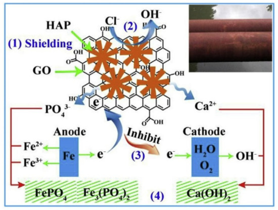 The anticorrosion mechanism of GO-HAP (Reproduced with permission from ref. [84]. Copyright 2019 Elsevier Publications).