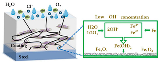 Additionally, abundant oxygen-containing groups on the surface and edge of GO can provide potential reactive sites for polymer-grafted modification [53,54,85,86,87,88]. Polymer-grafted GOs have gained extensive attention in recent years due to their extraordinary advantages. In particularly, they have been widely reported as anticorrosive pigments in waterborne epoxy coatings by forming a layered barrier and increasing the diffusion pathway of corrosive electrolytes. Zhu et al. [89] synthesized a compound pigment of polypyrrole-functionalized GO (GO-PPy) by an in situ polymerization method. Incorporation of the nanocomposite into waterborne epoxy coating can obviously improve the corrosion protection performance of the coating. The composite coating was painted on the surface of mild steel by wire rod brushing and the thickness of the coating layer was about 80 µm. The mechanism of corrosion resistance of the GO-PPy coated on mild steel is shown in Figure 16. The GO nanosheet perpendicular to the thickness of the coating provides a meandering diffusion channel for corrosive ions, which delays the occurrence of corrosion. In addition, the amino functional groups of PPy generate a crosslinking effect to the epoxy, decreasing the micro-pores in the epoxy. The conducting PPy can accept electrons and accelerate the formation of a passivation layer composed of Fe3O4 and Fe2O3.