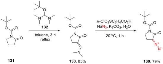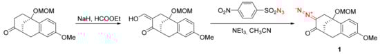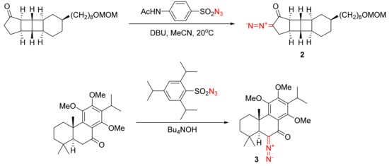 In some cases, however, when the target molecule does not have a nearby methylene or methyne group with similar acidity to the target methylene group, a direct diazo transfer becomes possible, as illustrated by the synthesis of polycyclic α-diazo ketones 2 and 3 (Scheme 2) [10,11,12,13].