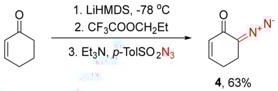 A standalone case is when a diazo transfer is employed to prepare β,γ-unsaturated α-diazo cyclic ketones, such as α-diazo cyclohex-β,γ-enones. The lowered acidity of the α-methylene group, along with the presence of the reactive double bond, mandate that the substrate is first α-trifluoroacetylated in the presence of a strong base at a low temperature. Thereupon, the de-trifluoroacetylative diazo transfer can already occur. This is illustrated by the synthesis of α-diazo δ,ε-cyclohexenone 4 (Scheme 3) [14,15,16].