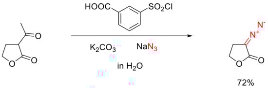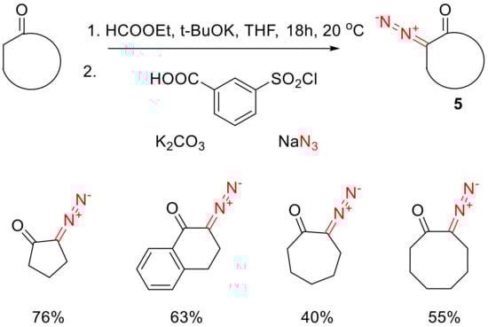 The main drawback of many diazo transfer reactions is the formation of an equivalent amount of sulfonamide, which requires the target product to be chromatographically purified. This drawback can be conveniently alleviated by the recently described modification of the diazo transfer reaction termed ‘sulfonyl-azide-free’ (SAFE), which allows, among other things, the synthesizing of cyclic α-diazo ketones. The key to this method is the use of water-soluble 3-(chlorosulfonyl)benzoic acid as the precursor to the respective sulfonyl azide. The latter is formed in situ under the influence of sodium azide in a weakly alkaline aqueous solution. To the solution, thus formed, a formylated cyclic ketone is added and, when the reaction is over, the target α-diazo ketone is simply extracted with chloroform while the unwanted sulfonamide remains in the water. This method turns out to be applicable to the preparation of high-purity five-to-eight-membered cyclic ketones 5 in good yields, the only surprising exception being cyclohexanone (Scheme 4) [17].