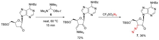 The major drawback of synthesizing α-diazo ketones using the diazo transfer reaction is the need to use a strong base. If the use of such bases must be avoided for some reason, a diazo transfer could involve, not a premade enol but rather, an enamine. Such enamines are easy to synthesize using the so-called Bredereck’s reagent (6) in reactions with the starting cyclic ketones. In this case, the use of a strong base is required at neither the enamine synthesis stage nor at the diazo transfer step, as illustrated, for example, by the synthesis of a rather sensitive nucleobase 7 derivative (Scheme 5) [18,19].