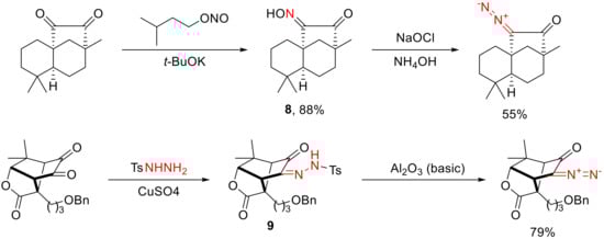 In one case, one of the two carbonyl groups is turned into an oxime (such as 8) with treatment with isoamyl nitrite in a basic medium, and the resulting oxime is oxidized to a diazo group [20]. Alternatively, one of the carbonyl groups can be transformed into a tosyl hydrazone, and the resulting hydrazone (such as 9) is fragmented with a base to give the target α-diazo ketone (Scheme 6) [21,22,23].