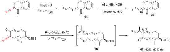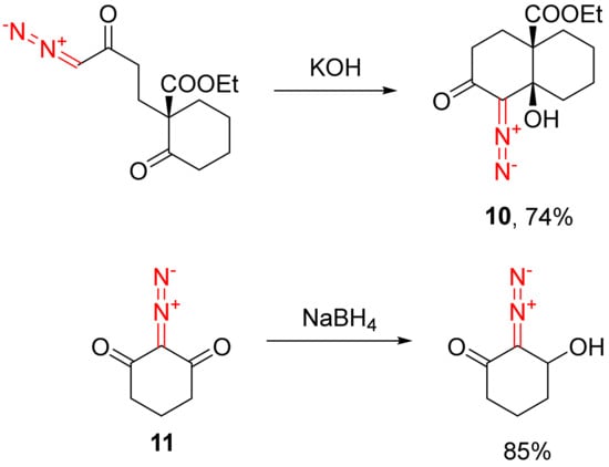 A separate case is represented by the synthesis of β-hydroxy-α-diazo cyclic ketones—an important class of diazo compounds. The most common way to access such building blocks is with a base-promoted intramolecular addition of a terminal diazo ketone to another carbonyl group (as shown for the preparation of 10) [24,25,26]. More simple derivatives of this class can be accessed from the respective diazo dicarbonyl compounds (such as 11) by desymmetrizing the reduction of one of the carbonyl groups (Scheme 7) [27].