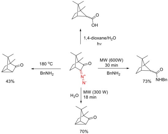 Notably, the α-carbonyl carbenes formed with the decomposition of cyclic diazo monocarbonyl compounds are more inclined to undergo the Wolff rearrangement than their acyclic counterparts, which is supported by quantum chemical calculations [28]. This has to do with the fact that, in acyclic carbenes, the unshared electron pair is stabilized due to the interaction with the orthogonally oriented π* orbital of the carbonyl group. Because cyclic diazo carbonyl compounds are conformationally fixed, such orthogonal orientation of the unshared pair of the resulting carbene and the carbonyl group cannot be achieved. Hence, the latter type of carbenes has a higher reactivity. For cyclic diazo ketones, the Wolff rearrangement has been shown to be more facile under microwave irradiation than under thermal conditions [29]. For the Wolff rearrangement under microwave irradiation, the choice of the solvent plays a crucial role. For instance, 3-diazo camphor microwave-irradiated in benzylamine gives an excellent yield of ketene adducts. Under thermal conditions, the sole product is that of a formal intramolecular insertion into the C-H bond. However, attempts to bring about the Wolff rearrangement in an aqueous medium does not lead to the formation of the respective carboxylic acid, even under microwave irradiation, since the intramolecular C-H insertion product is the sole one in this case. This has to do with the high absorption of the microwave irradiation by water (due to its high dipole moment) and the resulting heating of the reaction mixture. The said carboxylic acid can only be obtained from 3-diazo camphor under photochemical conditions in 1,4-dioxane (Scheme 8) [29].