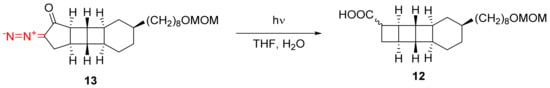 The Wolff rearrangement of α-diazo cyclopentanones has found broad applications in organic synthesis. In aqueous tetrahydrofuran or 1,4-dioxane, free cyclobutanecarboxylic acids can be obtained [11,33]. For example, in the total synthesis of ent-[3]-ladderanol, the third cyclobutene ring is introduced in key intermediate 12 through the Wolff rearrangement of the fairly complex α-diazo cyclopentane precursor 13 (Scheme 9). The low diastereoselectivity of the process does not present an issue because the carboxylic acid group is removed in the next step under acidic conditions [11].
