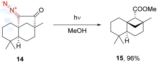 An alkoxycyclobutane carboxylate fragment can easily be obtained via the photochemical decomposition of the α-diazo cyclopentanone moiety in 14 in an alcoholic solution [34,35]. In some cases, the respective product 15 can be obtained diastereoselectively (Scheme 10) [7,20,36].