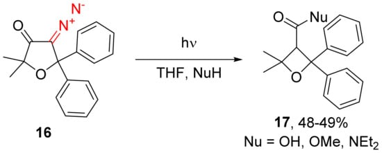 Not only α-diazo cyclopentanones can undergo the Wolff rearrangement with a subsequent nucleophile addition. Their heterocyclic analogs can undergo a similar transformation [37]. For instance, the photochemical decomposition of 4-diazodihydrofuran-3(2H)-ones, such as 16, in tetrahydrofuran in the presence of various nucleophiles, delivers derivatives of oxetan-3-carboxylic acids 17 in modest yields and moderate diastereoselectivity (Scheme 11) [18]. Unfortunately, the reported reaction is accompanied by numerous side-products, including products of the tetrahydrofuran addition, 1,2-migration and diazo function reduction [38,39].