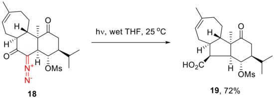 The Wolff rearrangement of carbonyl carbenes formed from α-diazo cyclohexanones has gained prominence in organic synthesis; however, it is less widespread compared to their five-membered counterparts. For instance, the photochemical decomposition of diazo compound 18 in wet tetrahydrofuran delivers the respective cyclopentane carboxylic acids 19 (Scheme 12) [40].