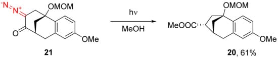 Alkyl cyclopentane carboxylate 20 is obtained in the course of the photochemical [30,41] decomposition of bicyclic diazocyclohexane 21 in the presence of methanol, usually employed as a solvent (Scheme 13).