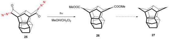 The decomposition of cyclic diazo ketones with a subsequent Wolff rearrangement can be employed, not only in total synthesis, but also for the construction of polycyclic cage structures. For instance, the photochemical transformation of bis-diazo cyclohexanone 25 into bis-methyl cyclopentanoate 26 is the key step in the synthesis of iso[1.1.1.1]pagodane 27 (Scheme 17) [44].