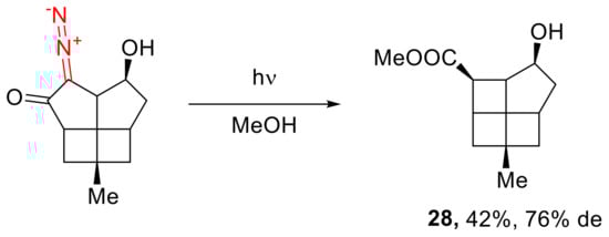The photolysis of the α-diazo cyclopentanone moiety in methanol was successfully employed toward the construction of [4.4.4.5]fenestrane skeleton (28) [40]. Other authors have managed to conduct that reaction diastereoselectively (Scheme 18) [8].