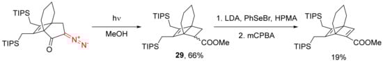 Another application of the photolysis of cyclic diazo monocarbonyl compounds is in the synthesis of the Dewar arenes. In this synthesis, the resulting bicyclohexenecarboxylic ester 29 is selenylated and oxidized with m-CPBA (Scheme 19) [35,45].