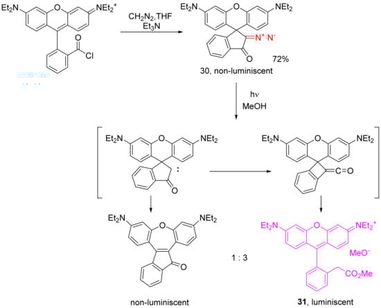 The reactions of cyclic ketenes with nucleophiles finds an interesting application in the dye chemistry. The diazo derivative of rhodamine obtained from the respective chloroanhydride is, itself, not luminescent, as it exists in the spiro form. However, its photochemical decomposition in methanol results in the formation of two products. The major product 31 results from the Wolff rearrangement and the addition of a methanol molecule, with a subsequent rupture of the cyclobutene cycle, in which an extended conjugate system is formed, and it demonstrates strong fluorescence. The minor product, resulting from a 1,2-aryl shift in carbonyl carbene, does not display luminescent properties (Scheme 20) [46].