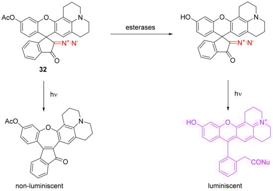 Particularly interesting is the mixed rhodamine–fluoresceine sensor 32 for esterases. The phenolic group in 32 is acylated which leads to a non-luminescing photo adduct. In the presence of esterases, 32 is de-acetylated and, upon photolysis and the addition of external nucleophiles, gives a strongly luminescent product (Scheme 21) [49].