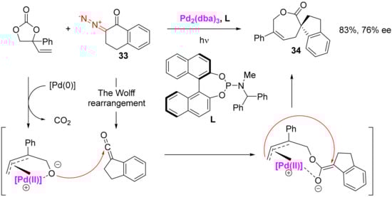 The ketene adduct with nucleophiles may turn out to be rather reactive itself and undergo various post-transformations. With the photochemical decomposition of β-diazo-α-tetralone 33 in the presence of vinyl ethylene carbonate and chiral palladium catalyst, spirocycle 34 is formed in high yield and ee. According to the proposed mechanism, the ketene interacts with the nucleophilic oxygen atom of alkoxy-η3-allyl ligand of Pd(II). The initial adduct, bidentately coordinated to Pd(II), undergoes intramolecular asymmetric allylic alkylation, which leads to the observed product 34 (Scheme 22). It is likely that β-diazo-α-indanone and its seven-membered analog can also undergo a similar transformation [50].