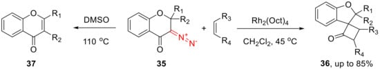The Wolff-rearrangement-derived ketenes can interact with more than nucleophiles. For instance, ketenes derived from 3-diazochroman-4-one (35) can undergo [2 + 2] cycloaddition with various olefins delivering 6-oxospiro[3.4]octan-1-ones 36 [51]. The presence of the catalyst is necessary to suppress a competition 1,2-alkyl migration, which would lead to 4-benzopyrans 37. Unfortunately, the reaction appears to be limited to 2,2-disubstituted 3-diazochoman-4-ones, as even monosubstituted ones predominantly undergo 1,2-hydride shift, and ketene is not formed (Scheme 23).