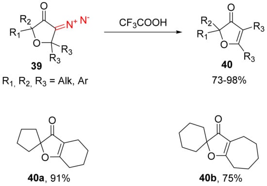 With the decomposition of α-diazocarbonyl compounds, the resulting diazonium salts can be stabilized via the β-to-α migration of substituents. The stability of 3-diazodihydrofuran-3(2H)-ones 39 towards various protic acids was investigated. The compounds were stable in acetic and formic acids; however, in stronger trifluoroacetic acid, products of β-migration 40 were obtained in high yields. The decomposition of the spirocyclic structures gave annelated products 40a–b (Scheme 25) [54].