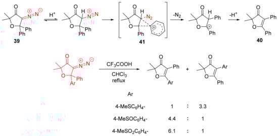 Mechanistically, the protonation of the diazo group can lead to the formation of the transition state 41. Upon migration, deprotonation gives the observed olefin 40. This mechanism can justify the selectivity for products 39 containing two different aromatic groups. More electron-rich aryls tend to migrate preferentially (Scheme 26) [55].