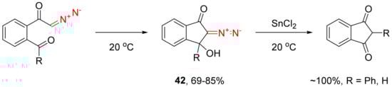 For β-hydroxy-substituted substrates, 1,2-migration leads to the enol formation (Tiffeneau–Demjanov rearrangement), whose main tautomer is the dicarbonyl compound. For instance, for 3-hydroxy-2-diazoindan-1-ones 42, formed in situ as the result of intramolecular condensation, decomposition with the subsequent migration of the phenyl substituent or a hydrogen atom takes place on catalysis with tin(II) chloride (Scheme 27) [25]. The same transformation can be catalyzed by p-toluenesulfonic acid [55].
