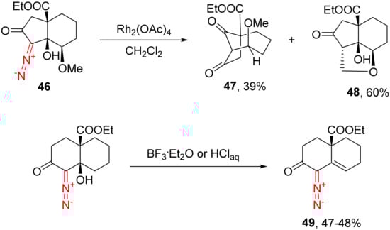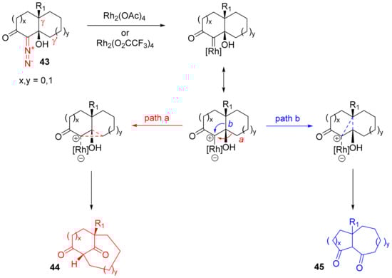 The decomposition of α-diazo-β-hydroxyketones with a subsequent Tiffeneau–Demjanov rearrangement can be employed for building cage structures. Bicyclic α-diazo ketones bearing a hydroxy group in β-position relative to the diazo group (such as 43) can be decomposed in the presence of tetracarboxylates of dirhodium. Since both carbon–carbon bonds leading to this hydroxy group can be fragmented, two products (44 and 45) can be formed in varying ratios. It is supposed that the alkyl migration takes place as a concerted process, which is supported by the preserved stereochemistry of the α-carbon atom (Scheme 28) [24].