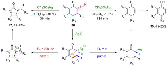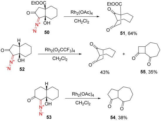 Since metal carbene is electrophilic in nature, the reactions primarily involve the rupture of the bond bearing higher electrophilic density on it. For instance, the introduction of an ethoxycarbonyl substituent in the γ-position of 1-diazo-7a-hydroxy octahydro-2H-inden-2-one 50 reduces electron b, and only the path a rearrangement product 51 is selectively formed. The selectivity is affected by the cycle size of the α-diazocarbonyl compound. Going from a five-membered cycle (52) to a six-membered cycle (53), the amount of the path b rearrangement product is increased. Due to stereochemical and energetic considerations, the formation of a cyclopentanone ring (54) is more preferred compared to a cyclobutene ring (55) (Scheme 30) [24].