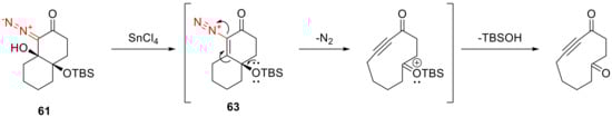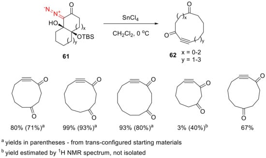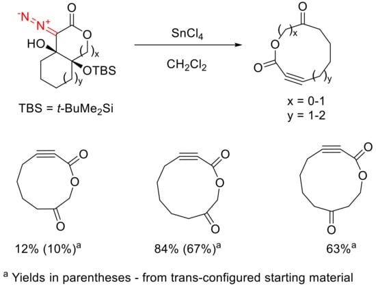 - Bayir, A.; Brewer, M. Fragmentation of Bicyclic γ-Silyloxy-β-Hydroxy-α-Diazolactones as an Approach to Ynolides. J. Org. Chem. 2014, 79, 6037–6046. [Google Scholar] [CrossRef]
