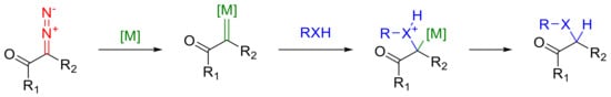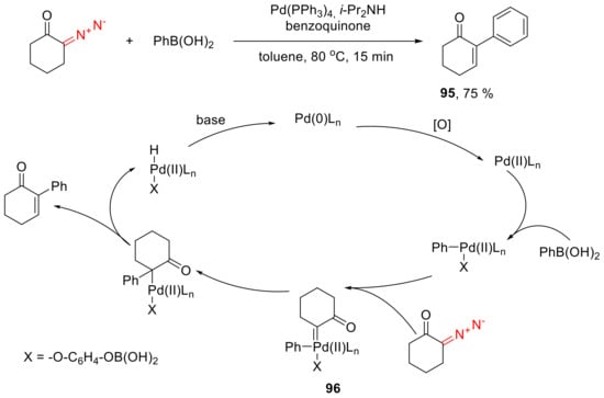 - Peng, C.; Wang, Y.; Wang, J. Palladium-Catalyzed Cross-Coupling of α-Diazocarbonyl Compounds with Arylboronic Acids. J. Am. Chem. Soc. 2008, 130, 1566–1567. [Google Scholar] [CrossRef]