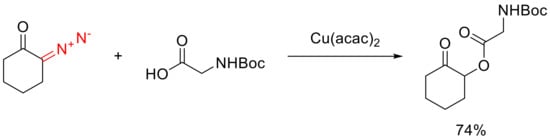 - Shinada, T.; Kawakami, T.; Sakai, H.; Takada, I.; Ohfune, Y. An Efficient Synthesis of α-Acyloxyketone by Cu(Acac)2-Catalyzed Insertion Reaction of α-Diazoketone to Carboxylic Acid. Tetrahedron Lett. 1998, 39, 3757–3760. [Google Scholar] [CrossRef]